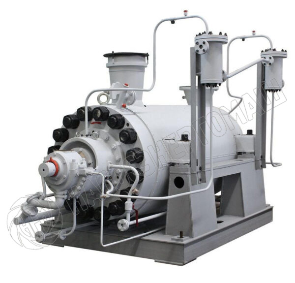 Motor driven horizontal multistage diffuser centrifugal pumps of segmental or barrel type with a withdrawable cartridge of ring-section type. Single flow impeller arrangement, with all the impellers facing the same way. May be operated both at the constant and variable speed of rotation. The pump rotor is carried by the oil-ring or pressure lubricated plain bearings. Shaft sealing: packed glands or mechanical seals.